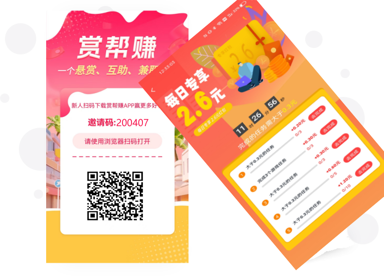 赏帮赚是一款以用户体验为主的广告体验服务平台,致力于帮助合规合法的产品在市场合法推广